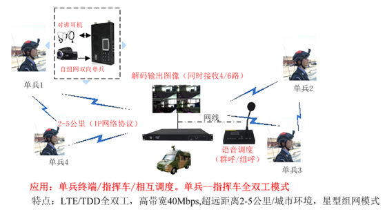 说明:系统可配置4台或多台自组网单兵背负设备,每台设备可采集前端的视频图传通过无线自组网链路传输到指挥车的接收基站,接收基站硬解码可输出1080P的高清图像的显示器上。